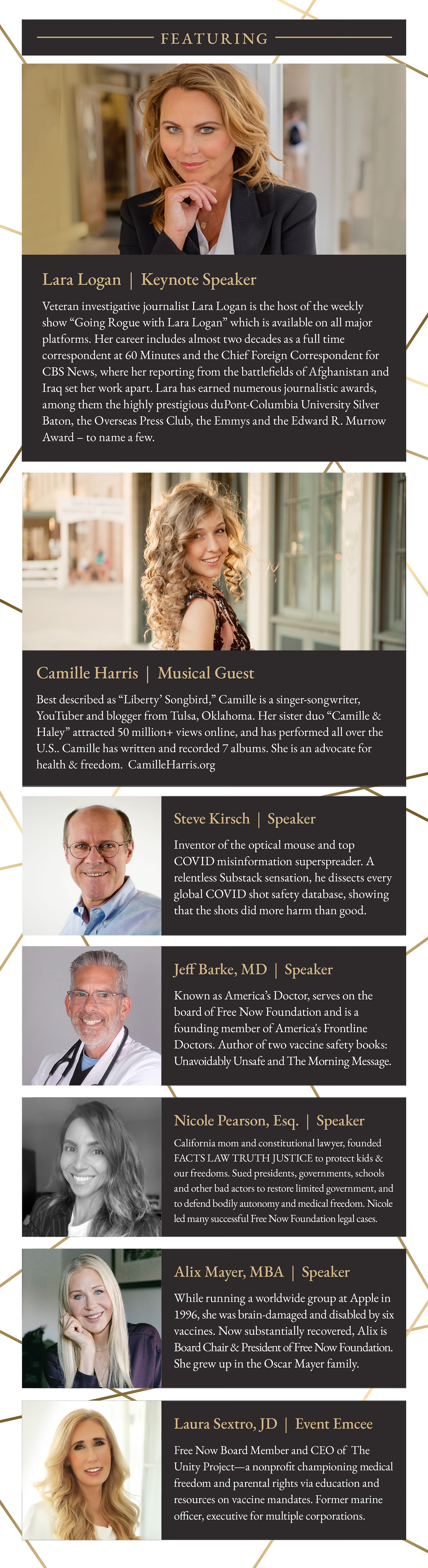 Optional pre-event VIP reception includes photo & conversations with: Lara Logan, Steve Kirsch, Attorney Nicole Pearson, Dr. Jeff Barke, Laura Sextro, Sasha Latypova, musical guest Camille Harris and me.
